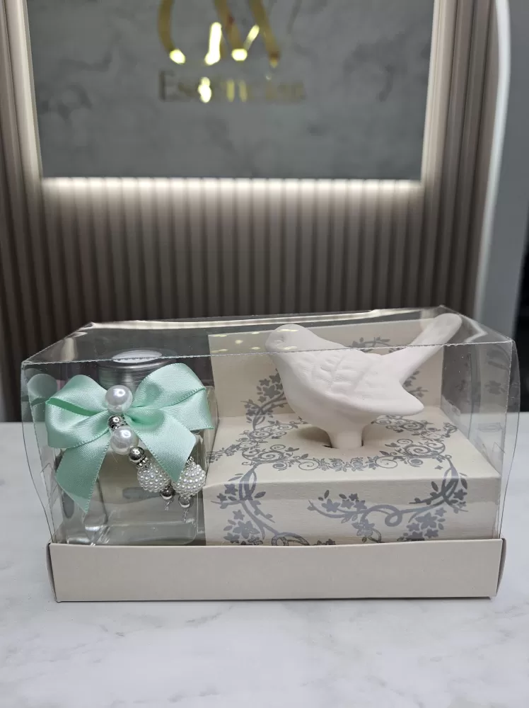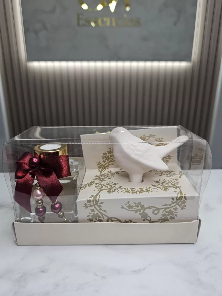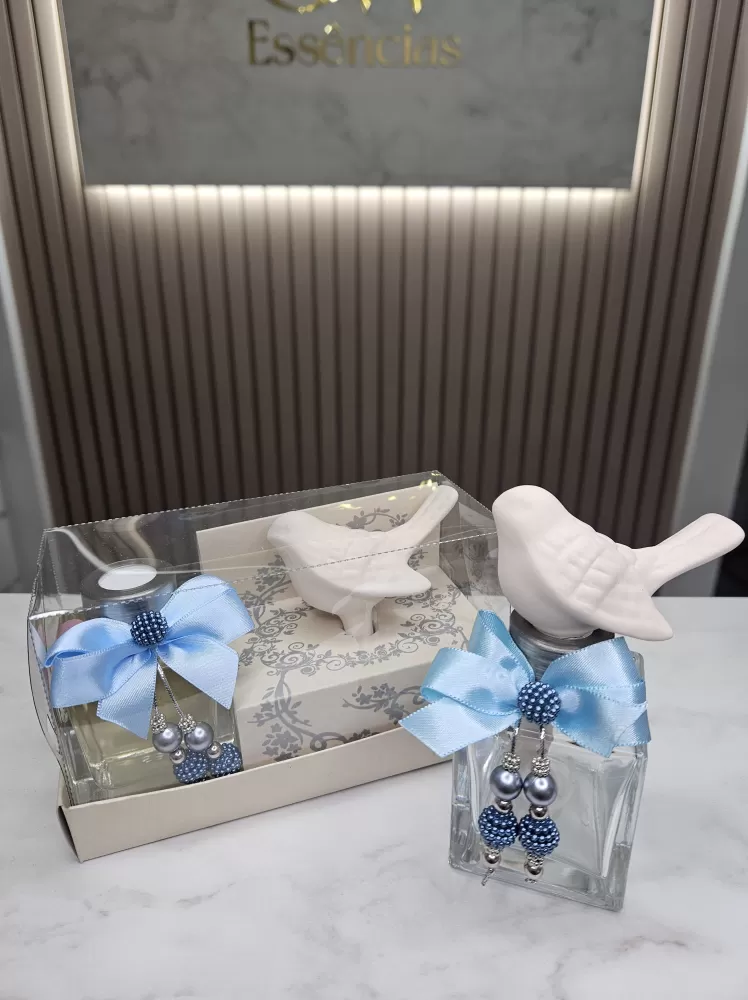 Frasco de difusor de 100ml e 1 passarinho de gesso aromatizador. Aromas conforme disponibilidade (entrar em contato com a loja).