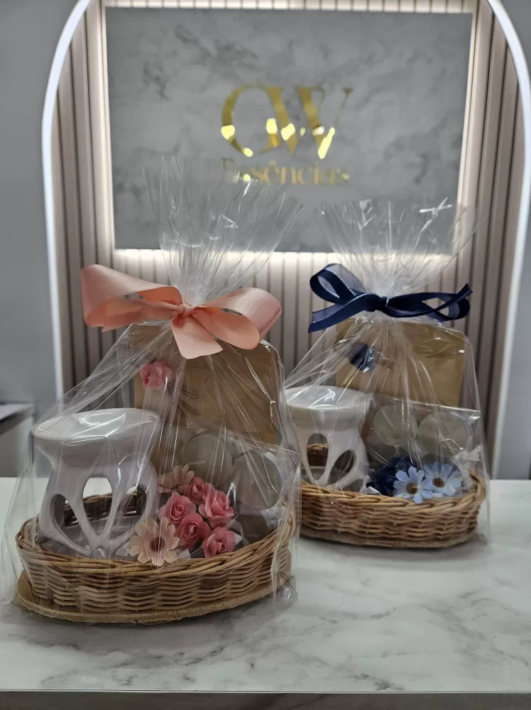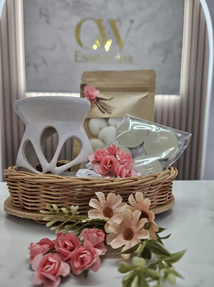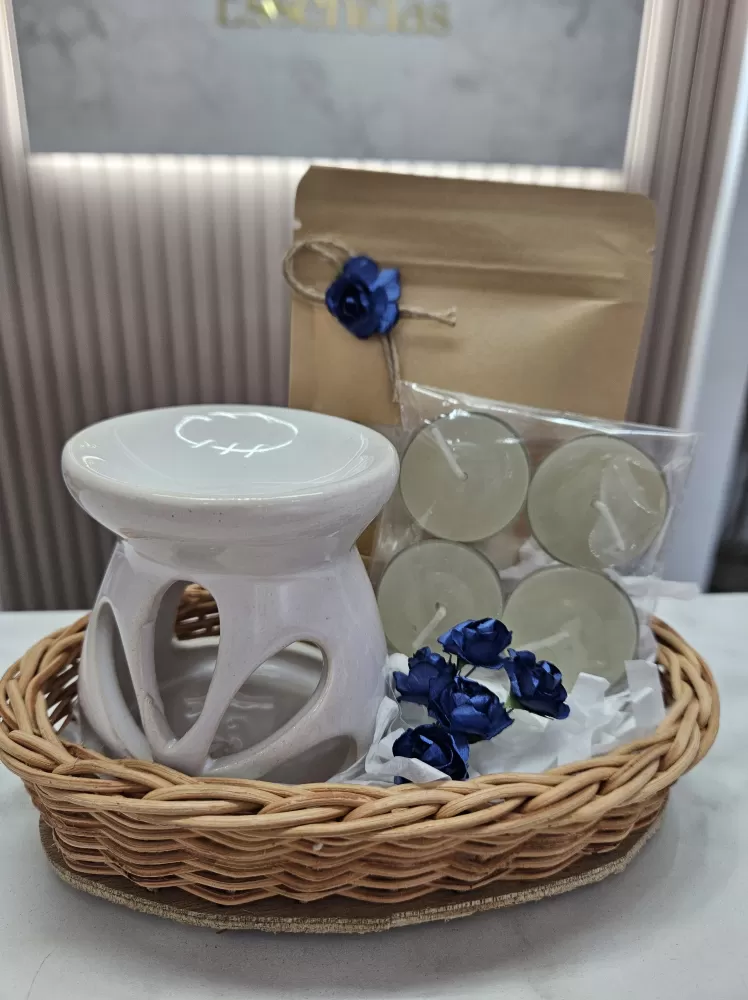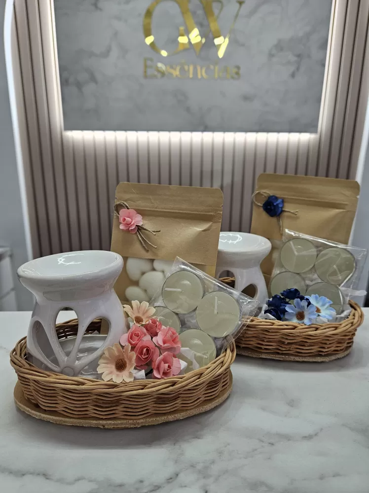 Kit com um Rechaud de cerâmica,um pacote de pastilhas aromáticas( Wax Melts),um pacote de mini velas.